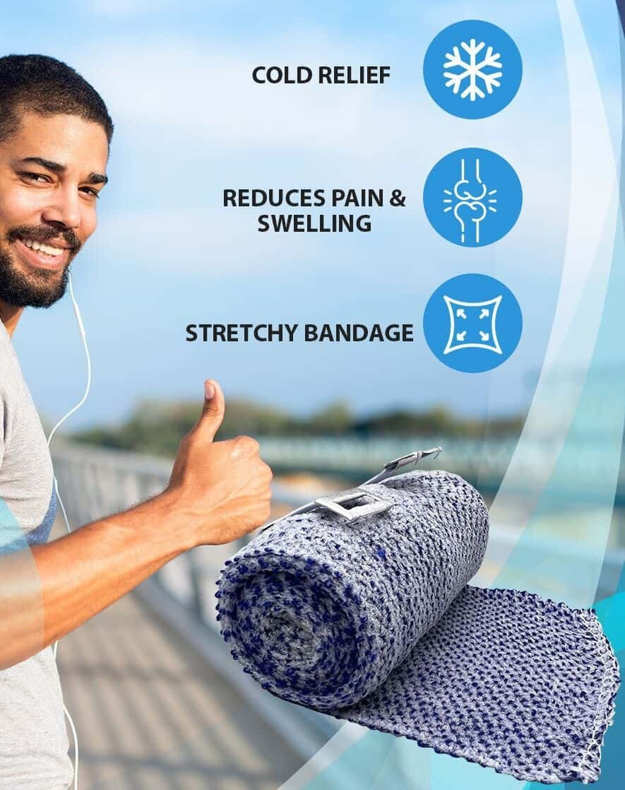 El material elástico puede ajustarse fácilmente alrededor de cualquier parte del cuerpo, por lo que es una gran alternativa a una bolsa de hielo instantánea. La venda puede permanecer fría hasta 2 horas.